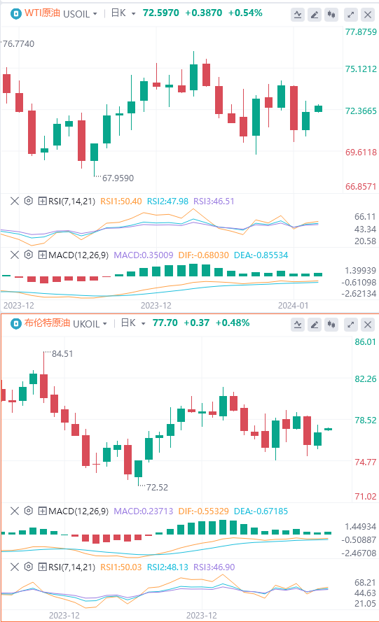 原油(WTI)价格走高至每桶72.50美元附近,连续第二个交易日扩大涨幅。近期原油价格的上涨可归因于几个因素。美国的原油库存数据显示,截至 1 月 5 日的一周内,美国原油库存减少,超出了市场预期。此外,伊朗支持的胡塞武装分子在红海对船只发动了大规模袭击,加剧了市场对石油供应的担忧。截至目前,WTI原油报价72.59美元,Brent原油报价77.7美元。