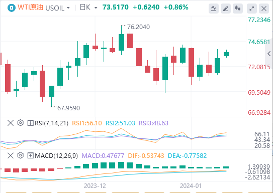 周四WTI油价周四波动较大,全面上涨,周四WTI油价开盘于71.50美元下方,并在全天数度突破关键水平后测试73.00美元关口。周四WTI油价最高触及每桶74.00美元,随后回落至72.00美元。WTI油价再次反弹,测试73.00美元关口,美国原油重新回到自2024年初以来一直维持的总体交易区间。WTI油价日图K线继续处在200日均线78.00美元关口下方,近期下行走势进一步受到50日均线74.00美元的支撑。