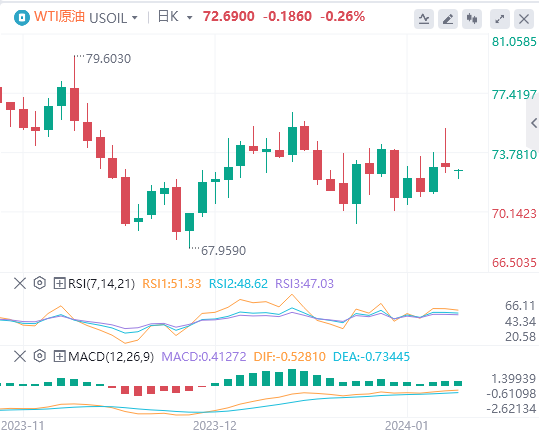 原油(WTI)周五升至2024年新高75.27美元,在美国和英国海军对胡塞叛军发动袭击后,能源市场对持续的地缘政治紧张局势的溢出效应越来越紧张,这些叛军一直以也门海岸附近的民用货船和油轮为目标。最近几周,胡塞武装对开往苏伊士运河的船只的袭击席卷了石油市场,因为连接欧洲和中东的供应链在非洲大陆的航道被转移。