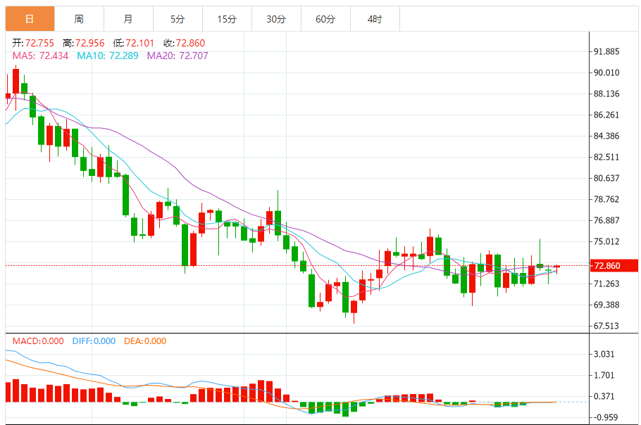 周二(1月16日),美原油上涨,现报72.82美元每桶,涨0.57%。过去两周,WTI原油价格在20天移动均线附近起伏。