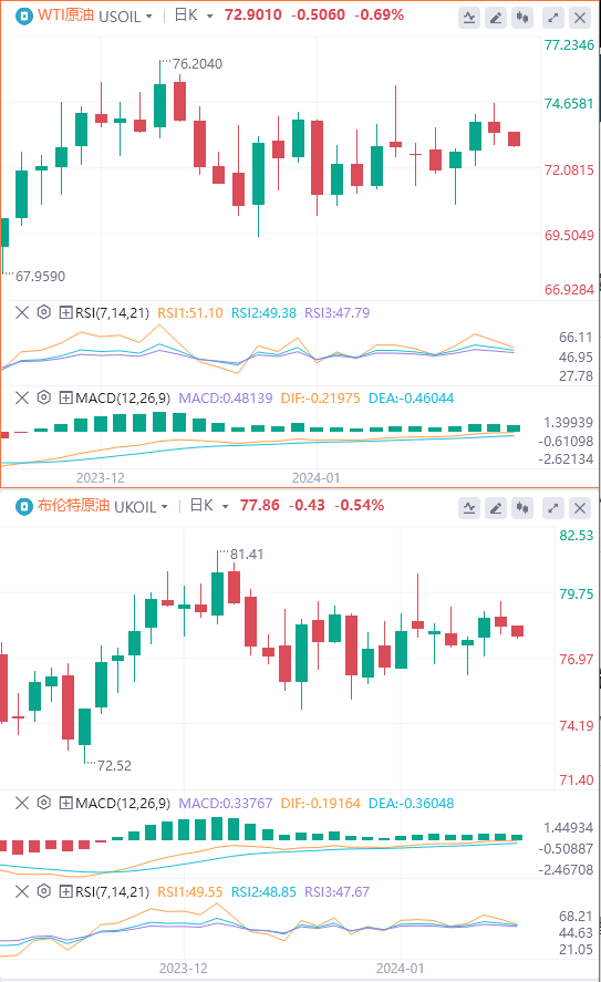 基本面上,原油市场现在面临很多问题,其中最重要的是生产过剩。每天的产量 比全球所需的多出300万桶左右。而红海问题除了让人头疼之外什么都不是,世 界上相当多的石油都要经过那里。由于其中一家炼油厂正在维修,美国也有一定 数量的原油停产。如果其他因素没有变化,就要留意各国央行能否通过降息来刺激经济,从而推动原油需求回升。