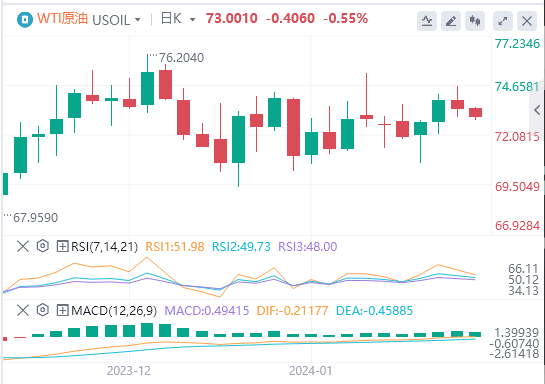原油期货,目前每日价格为72.92美元,略低于前一交易日收盘价73.25美元,表明看跌情绪轻微。该价格也低于200天和50天移动平均线,分别设定为76.55美元和73.73美元,强化了看跌前景。