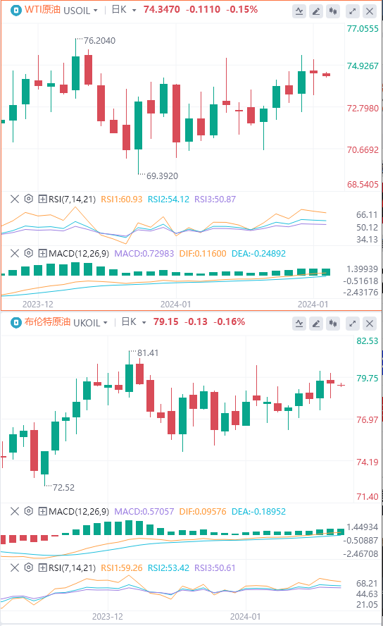 此前WT原油顺利突破21日指数移动平均线,这一进展将安抚多头情绪,因为随后原油价格还从底部向上触及75美元的阻力位。但是,现在行情仍缺乏明确的突破信号以及新的上涨动力。如果WTl原油干净利落地突破75.00美元,那后续的技术面买盘可能就会推动原油向77.50-77.60美元区域的200日均线迈进。如果原油始终未能突破75美元阻力,而且随后的行情跌破73美元的支撑,那这将带来一个新的看跌信号,在这种情况下,WTI原油可能继续跌向去年12月的低点67.87美元。