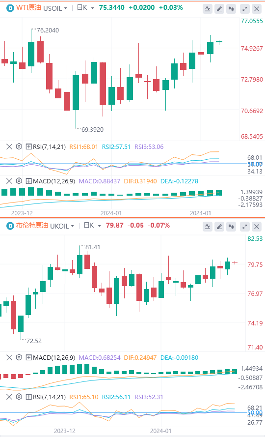 原油价格仍徘徊在窄幅区间内,布油和WTI原油整个月都分别在为站上80美元和75美元而努力。自去年12月红海危机以来,油价仍在逐步走高,表明交易员的抛售意愿有限,他们担心中东地缘政治紧张局势可能升级,威胁到该地区主要产油国的供应。尽管出现这种结果的可能性仍然很小,但这种风险还是成功地支撑了价格,否则在供应充足和需求疲软的情况下,原油价格更可能会下跌。