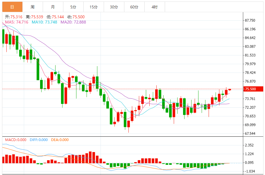今天的预期交易范围:在74.00支撑位和77.00阻力位之间