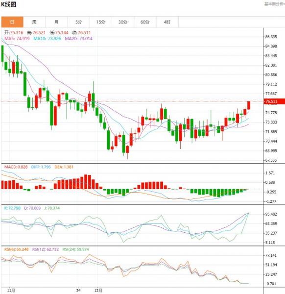 上方短期关注76.5-77.0一线阻力