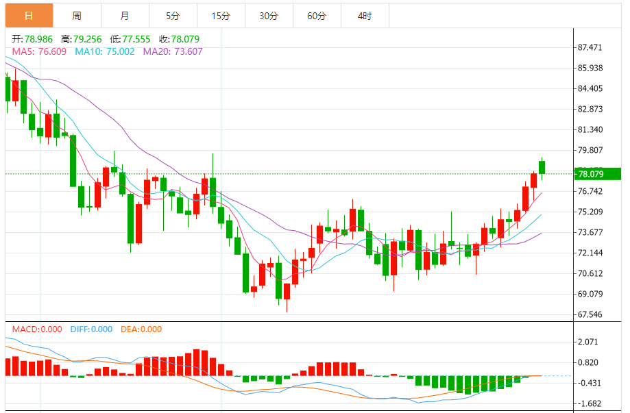 周一(1月29日),WTI原油价格在亚盘早盘延续上周五上涨走势,WTI原油盘中超过79美元每桶,布伦特原油盘亚盘时段三次测试83美元。欧盘早盘,原油价格迅速转跌。截至发稿,美原油连续报77.75美元每桶,跌幅0.40%。布伦特原油连续现报82.71美元每桶,跌幅0.29%。