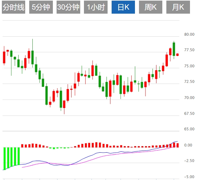今日预期交易区间为支撑位75.20和阻力位78.00之间。