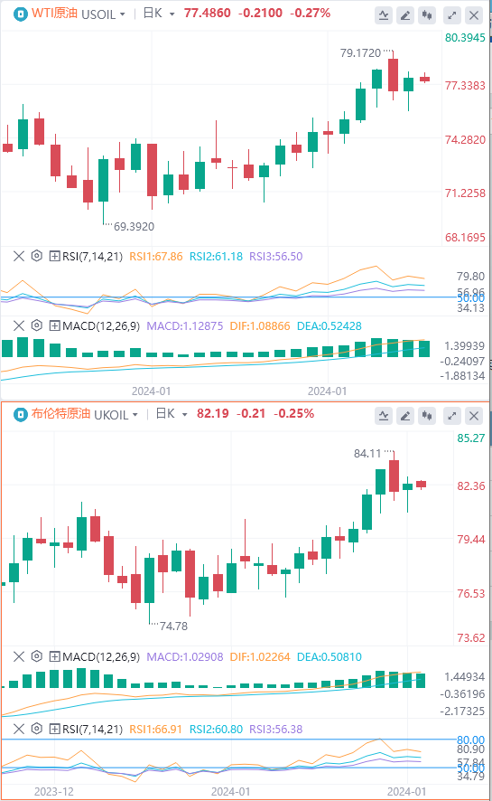 由于IMF上调今年全球经济增长预测提振了需求前景,国际原油由跌转涨,市场还在等待美国将如何应对其军队在中东遭受的致命无人机袭击。截至目前,WTI原油报价77.48美元,Brent原油报价82.19美元。