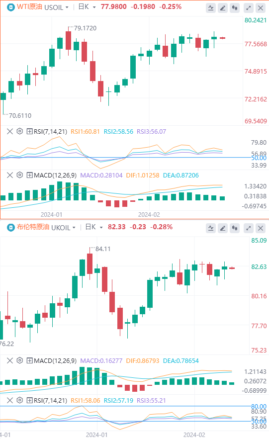 WTI原油的交易价格在78.00美元左右。由于EIA原油库存报告略低于预期,且中东地缘政治紧张局势仍不明朗,WTI价格走高。美国能源信息署(EIA)周四报告称,截至2月16日当周,原油库存增加了351.4万桶,而前一周的增幅为1200万桶。