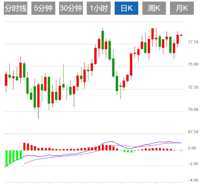 今日预期交易区间在77.50支撑位和80.40阻力位之间