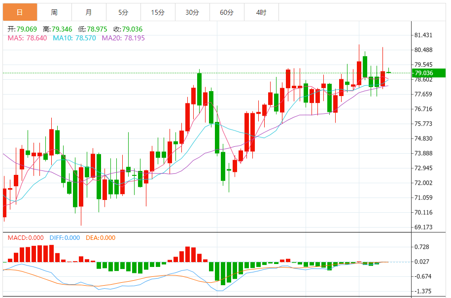 4小时图围绕布林道上下轨之间拉锯洗盘,周初回踩在下轨77.50一线启稳后,昨日收复再摸高上轨二次承压,形态上没形成突破。反复拉锯当中。等待区间破位再决定空间延续。目前短线还是区间拉锯震荡当中。操作上区间卡点灵活应对。