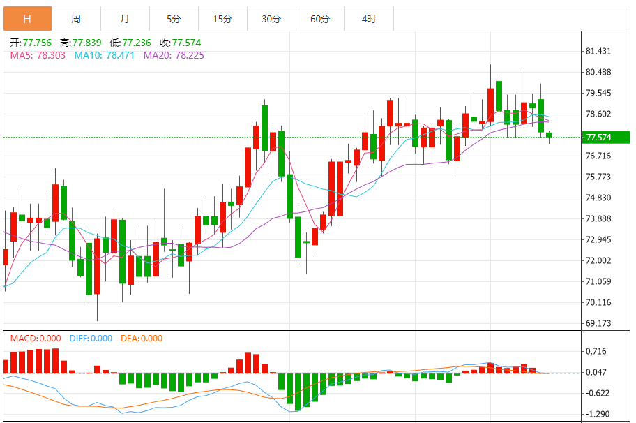 今天的预期交易范围:在75.70支撑位和78.70阻力位之间