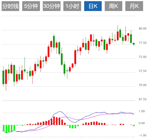 技术日图显示,WTI原油上周五出现了明显的跌幅,跌破78.25,今日进一步跌至77.30的38.2%斐波那契修正水平。通过观察图表得知,现已生成负面图形双顶形态,下方目标为76.15,之后是75.00。因此,预计未来将出现进一步下跌,不过如果价格突破77.80将停止预期的下跌,并导致价格尝试重新上涨,如果价格进一步突破78.70,涨势将得以延续,并推动价格重回上涨趋势。