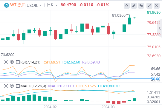 WTI美国原油周四攀升至81.50美元的数月高点,跌至81.05美元,然后回落至80.50美元的水平。WTI原油在从上周尾盘低点反弹至76.50美元后走高。美国原油自下而上上涨了近60%。日K线走高,突破了200日简单移动平均线(SMA)附近的长期盘整区间,接近78.00美元。美国原油价格较11月接近每桶68.00美元的最低价上涨了近19%。