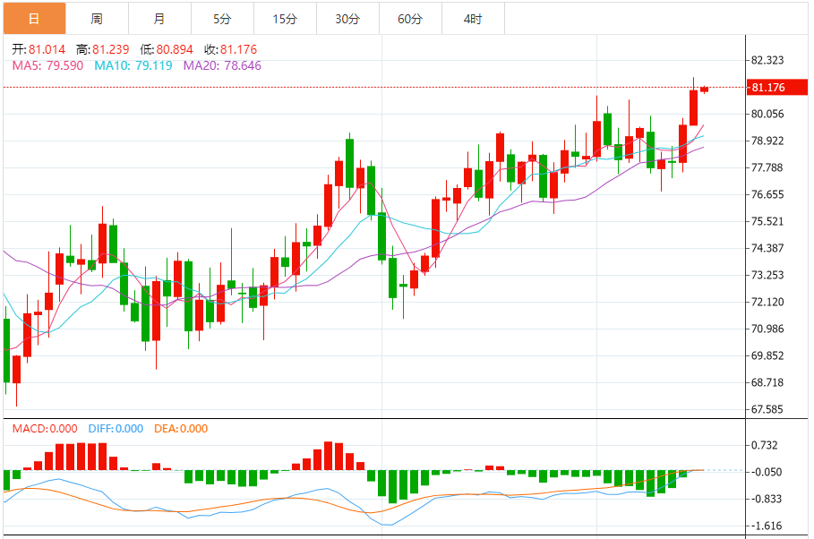 周五(3月15日),美原油价格交投于81.170美元/桶附近,涨幅为0.15%。周四油价连续第二天大涨,IEA月报给油价再添了一把火,WTI借势冲上80美元,布伦特原油突破了85美元,继SC原油突破后,欧美油价也均刷新了年内高点,完成了对过去几周盘整区间的突破。