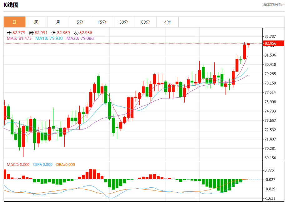 周二盘中,WTI原油报82.969,涨幅0.20%。