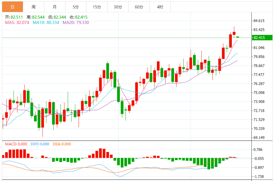 周二(3月19日),美原油价格交投于82.429美元/桶附近,跌幅为0.85%。油价周二的走势仍显示了其强势格局,继续刷新年内高点。在技术性超买的背景下,油价的调整带有明显的抗跌特性,日内大部分时间强势横盘震荡,夜盘继续走高。