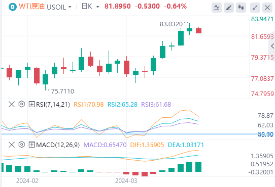 原油小幅走低,报81.89美元,下跌0.64%。这一走势反映了石油市场的谨慎乐观情绪,围绕关键支点82.31美元。市场划定了明确的阻力位在83.27美元、83.99美元和84.74美元,这可能会限制进一步的上涨。