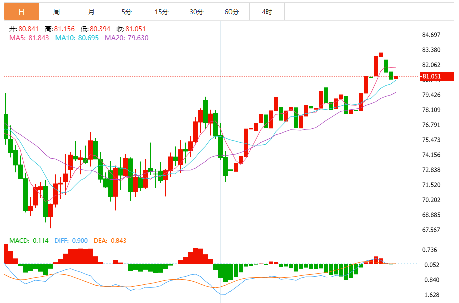 原油日线连阴回撤收低,没能强势收复前一日的小阴线回落失地 反倒是延续了弱势走低回落,日线以宽幅拉锯震荡呈现,边整理回踩边蓄势反弹的走法,多空单边动能不足,就会反复拉锯震荡。日线上升趋势线的支撑在78.70.目前短线还是处于上升趋势中线回撤修正。