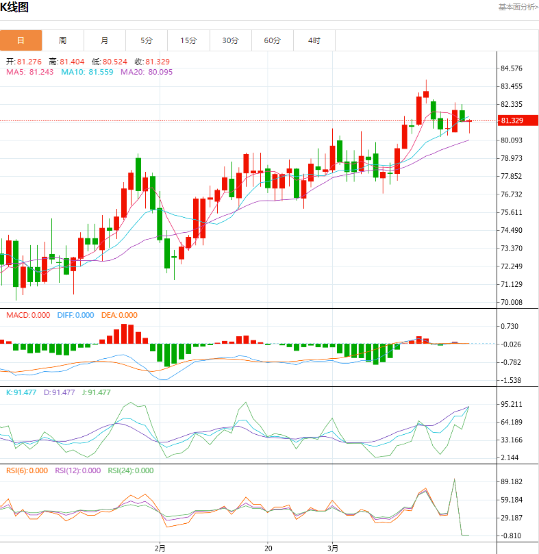 原油周二(3月26日)没有延续前一天的涨势,日线收阴在81.2。尽管油价从日线形态看处上行通道,不过83不破将继续回调;四小时线,呈区间震荡,油价处于中轨,还有下跌,关注晚间EIA数据表现。