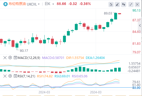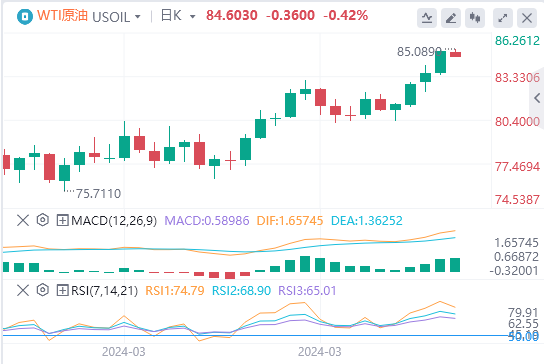 创2023年10月以来新高。美元走软以及地缘政治不确定性带来的供应担忧支撑WTI油价上涨。截至目前,WTI原油报价84.60美元,Brent原油报价88.66美元。