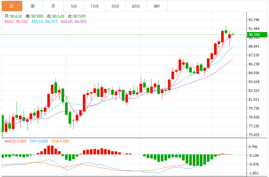 周二(4月9日),布伦特原油价格交投于90.580美元/桶附近,涨幅为0.23%。随着越来越多的市场参与者开始看多原油,上周基本面和地缘政治因素推动油价升至每桶90美元以上。