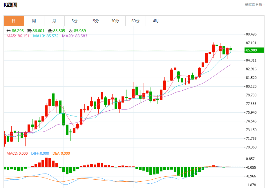 周四盘中,WTI原油报85.825,跌幅0.49%。
