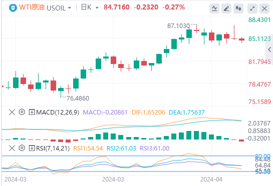 尽管上周末伊朗袭击了以色列,但WTI油价仍未能吸引买家。目前,原油价格略低于85.00美元,当日几乎持平,交易商正在等待以色列对伊朗袭击的回应,然后再下新的方向押注。截至目前,WTI原油报价84.71美元,Brent原油报价89.53美元。
