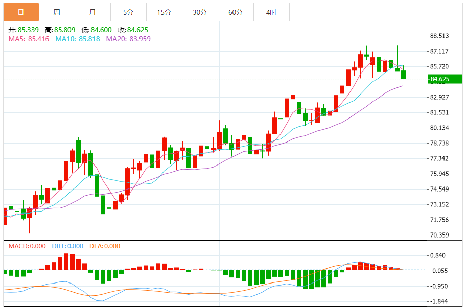 今天的预期交易范围:在83.60美元的支撑和86.60美元的阻力之间。