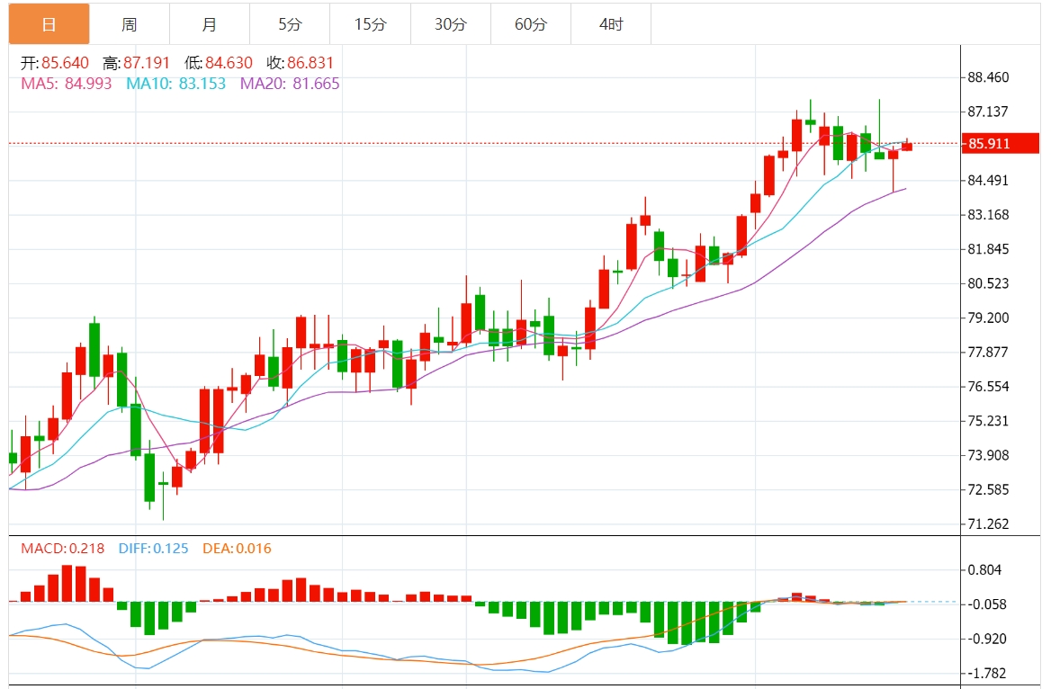 短线来看,油价后市走势变数较大,上周五的长上影线暗示上方阻力较强,周一的长下影线暗示下方存在较强的逢低买盘,市场情绪波动也比较大,美原油建议关注84.03-87.61区域突破情况。考虑到MACD死叉运行,KDJ死叉运行,后市短线略微偏向震荡下行。