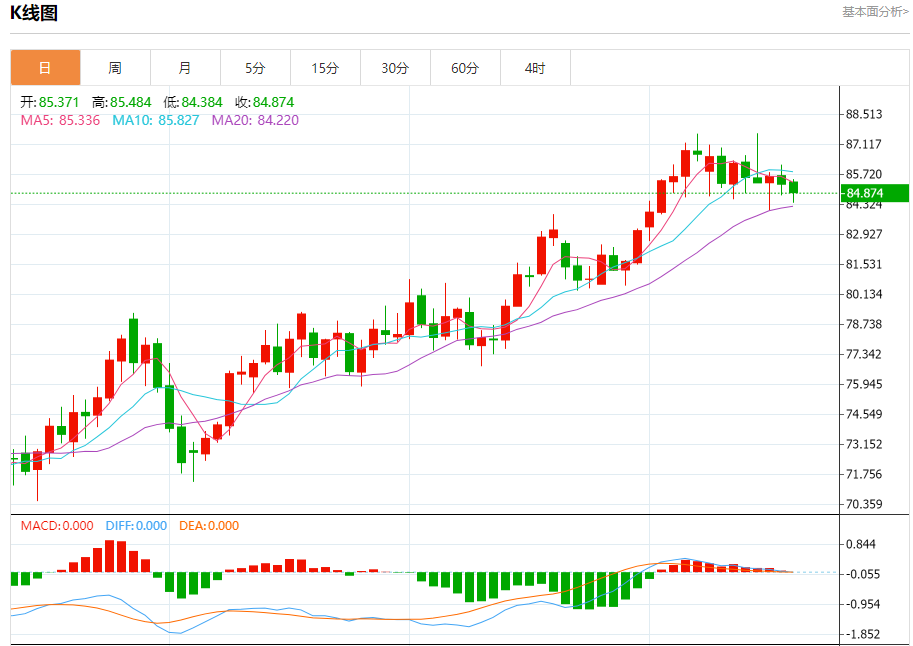 周三盘中,WTI原油报84.684,跌幅0.68%。