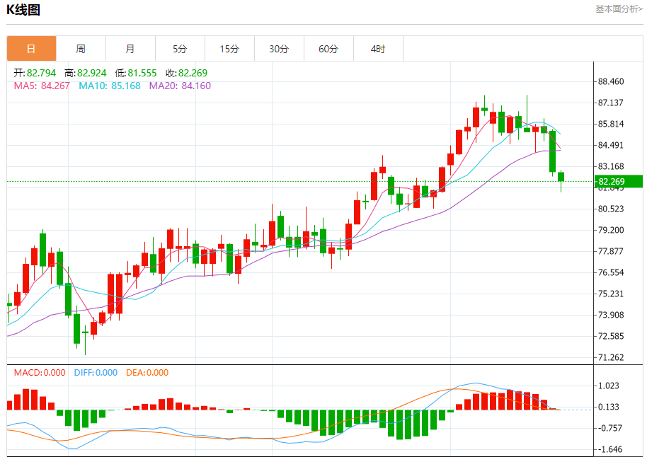 周四盘中,WTI原油报82.265,跌幅0.70%。