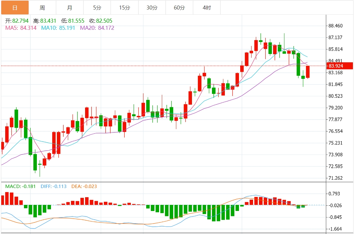 整体来看,中东地缘局势暂时没有进一步恶化,而美联储降息预期推迟,油价短线相对弱势,面临进一步回调风险,美原油关注80整数关口和200日均线的关键位置支撑,上方留意5日均线83.74附近阻力。