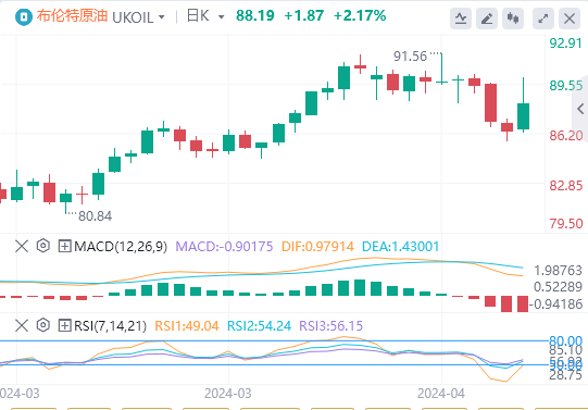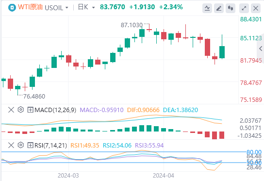 一位美国官员证实以色列导弹击中了伊朗境内的一个地点,以色列和伊朗之间的紧张局势升级,WTI油价获得上涨动能。截至目前,WTI原油报价83.76美元,Brent原油报价88.19美元。
