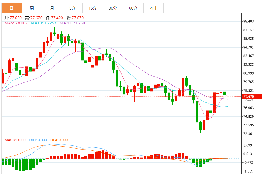 上方5日均线阻力在78.02附近,重点关注200日均线79.57附近阻力,若能顶破该阻力,则增加后市看涨信号。