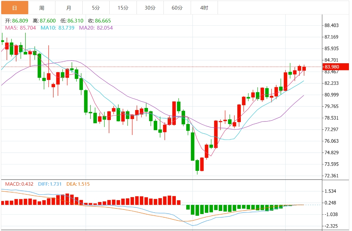 日线级别,油价自6月5日以来处于单边上涨走势,短期均线多头排列,MACD金叉良好运行,布林带开口,多头仍占据明显上风,之前尽管受到4月26日高点84.46附近阻力压制,但油价回调力度较小,暗示后市仍有计划继续震荡走高,如果顶破84.46附近位置,则有望进一步试探4月19日高点86.26附近位置阻力。下发留意10日均线82.48附近支撑,若意外失守该支撑,则增加短线见顶风险。