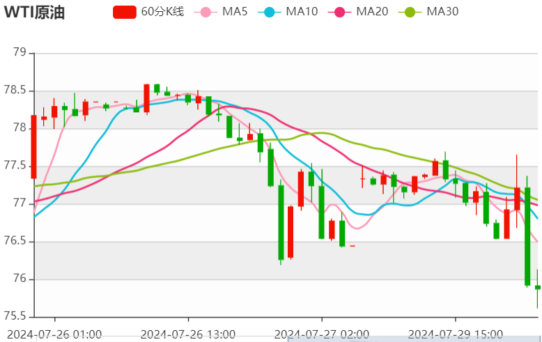 WTI原油回落至76美元/桶下方,日内跌0.06%。