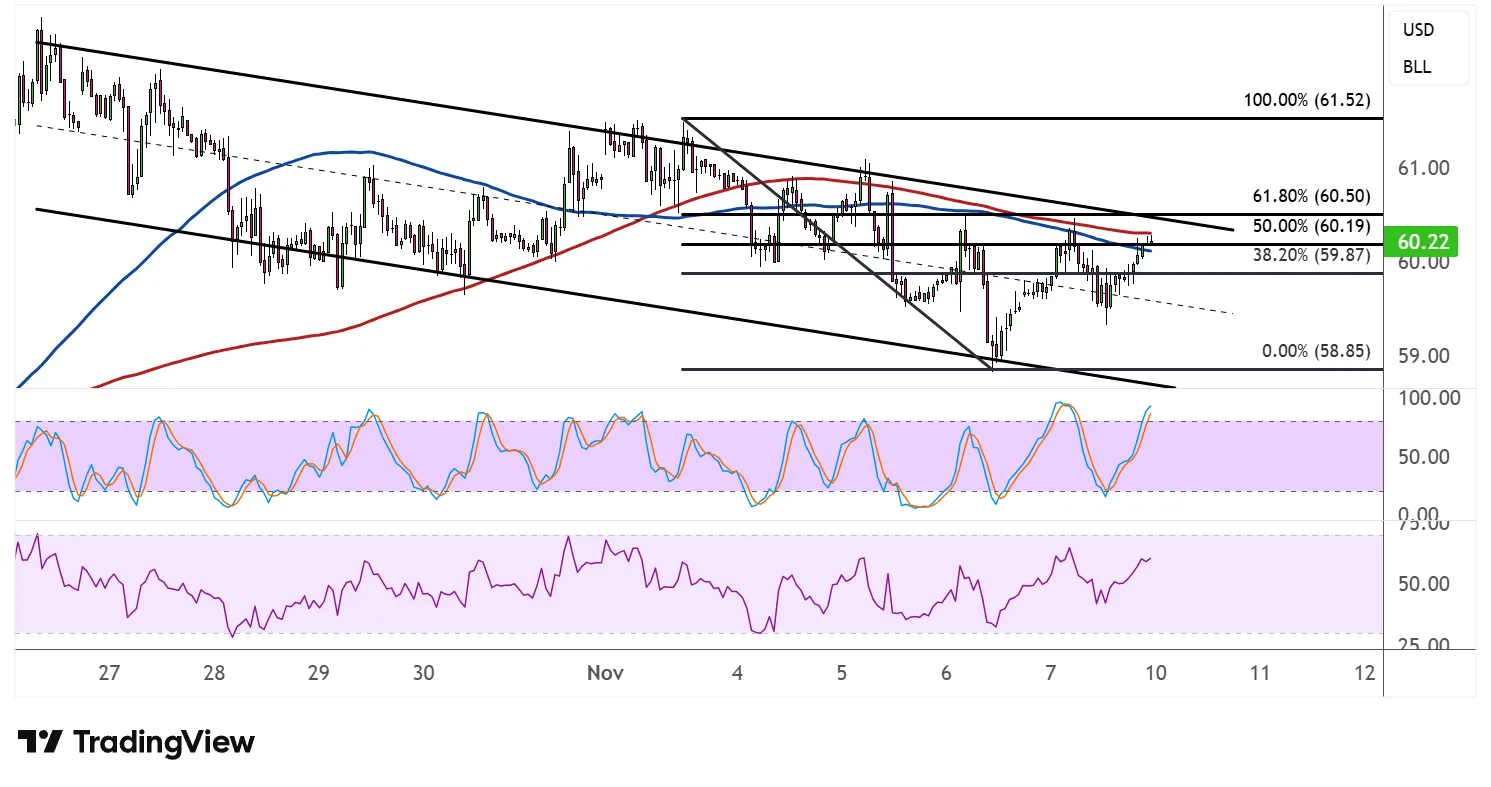 如果通道顶部和斐波那契水平继续保持上限,WTI原油可能会恢复下滑至每桶58.85美元左右的波动低点,或更低至接近58.00美元的通道底部。另一方面,跌破通道支撑位可能会引发更大幅度的下跌,从而创下新低。