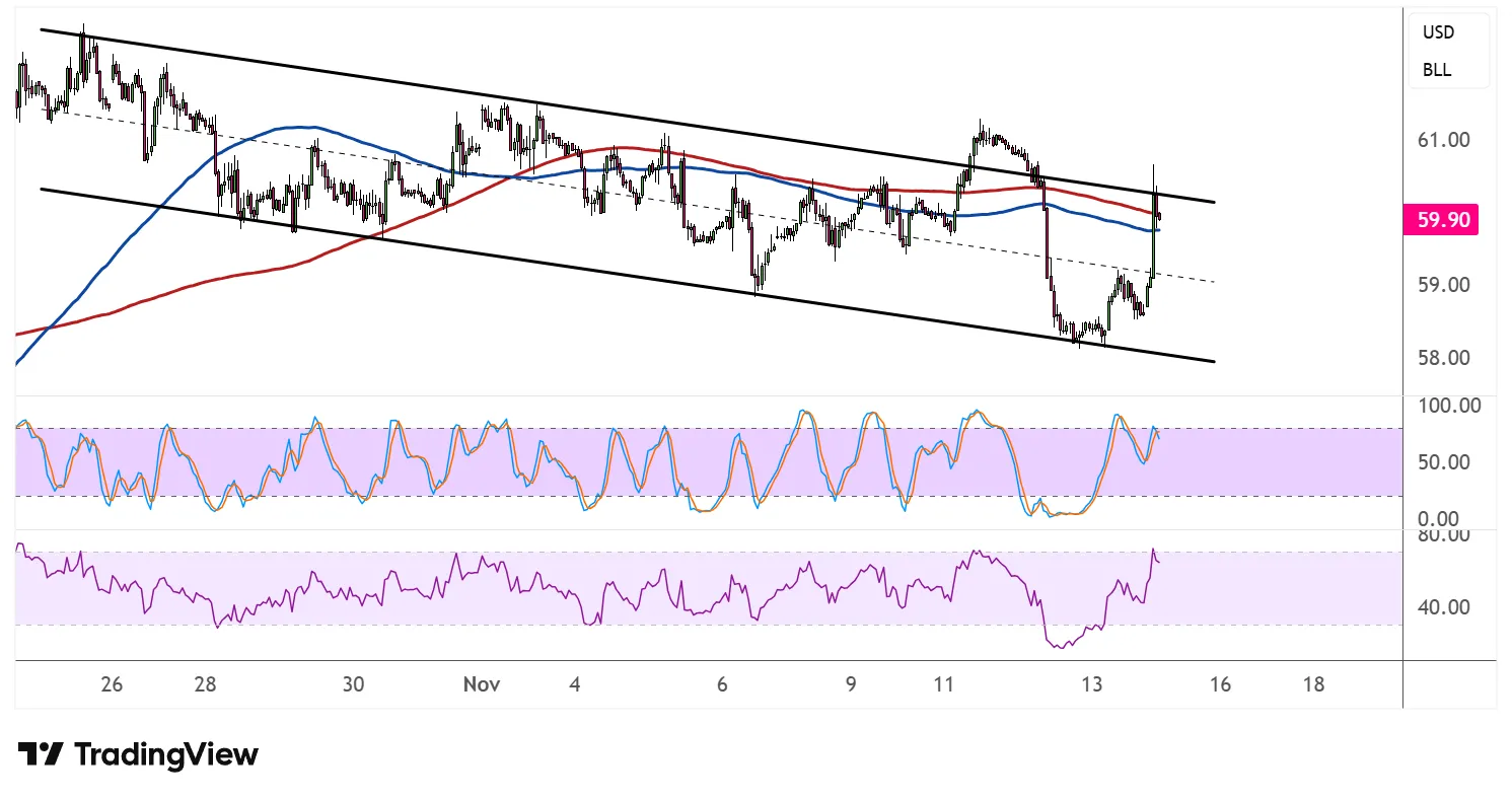 反弹至每桶60.50美元左右的通道中部区域可能会吸引新的抛售兴趣,而更大的修正可能会达到61.00美元附近的通道顶部或100SMA动态阻力位,这可能是看跌回调的沙线。