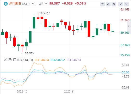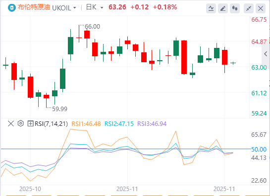 周四亚洲早盘交易中,油价走高,基准原油价格从前一交易日近2%的跌幅中部分收复。市场正在权衡需求疲软和供应风险等因素,而俄罗斯石油制裁的最后期限临近也支撑了油价。截至发稿时,布伦特原油期货上涨约16美分,涨幅0.25%,至每桶63.67美元;美国西德克萨斯中质原油期货上涨约17美分,涨幅0.29%,至每桶59.42美元。此前,周三油价大幅下跌,原因是有关俄罗斯重启乌克兰战争外交努力的报道,其中包括一份和平谈判框架草案。该报道增加了俄罗斯恢复供应的风险,加剧了市场对供应过剩的担忧。