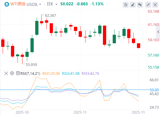 11月21日,原油(WTI)价格在周五亚市连续第三个交易日延续跌势,交投于每桶58.00美元附近。随着乌克兰-俄罗斯紧张局势缓解,降低了对俄罗斯石油制裁减少的可能性,原油价格下滑,可能会提升全球供应。本周市场情绪转为看跌,华盛顿推动和平计划以结束三年的冲突。