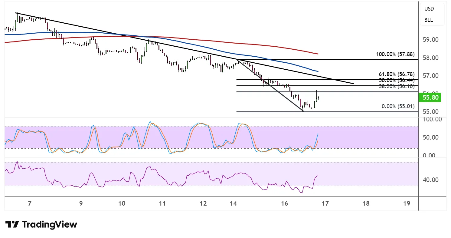 斐波那契回撤工具从57.88美元起伏高点至55.01美元起伏低点,揭示了修正可能停滞的潜在阻力区。38.2%的Fib位于56.10美元,50%的水平对应56.44美元。