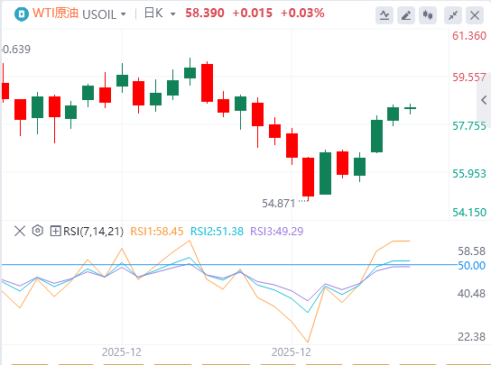 在持续的地缘政治紧张局势下,例如美国对委内瑞拉油轮的行动,WTI价格持续上涨。截至目前,WTI原油报价58.39美元,Brent原油报价62.42美元。