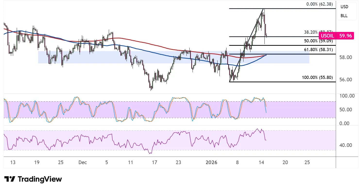 斐波那契回撤工具显示了更多多头可能在哪里等待攀升。38.2%的Fib位于59.87美元,50%的水平对应为59.09美元。更大的修正可能达到61.8%的斐波根58.31美元,该位置更接近突破阻力,可能是多头回调的临界线。