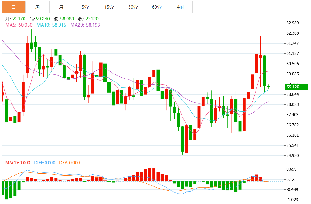 关键支撑位集中在58.80—59.00美元区域,该位置为前期平台与60日均线交汇处,若有效跌破,下一目标可能指向56.50美元;上方阻力则位于60..0美元与62.00美元。整体来看,日线级别已转为震荡偏空结构,短期反弹更可能被视为修复性行情。