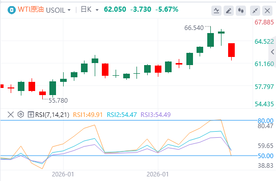 2月2日,原油在周一欧洲早盘交易时段交易时段约为61.80美元。随着美伊紧张局势缓解,WTI价格下跌了5.65%。交易员将密切关注美伊谈判的最新进展。