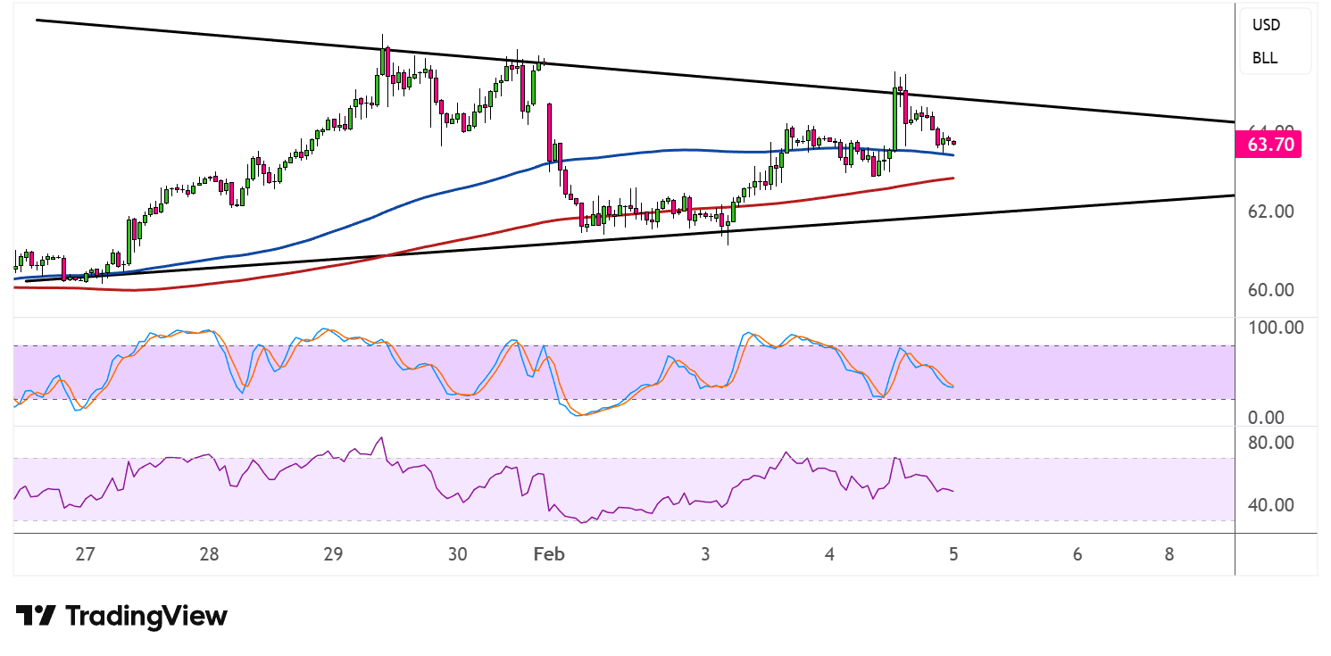 该商品目前交易价格约为每桶63.70美元,接近地层顶点时在该狭窄区间盘整。