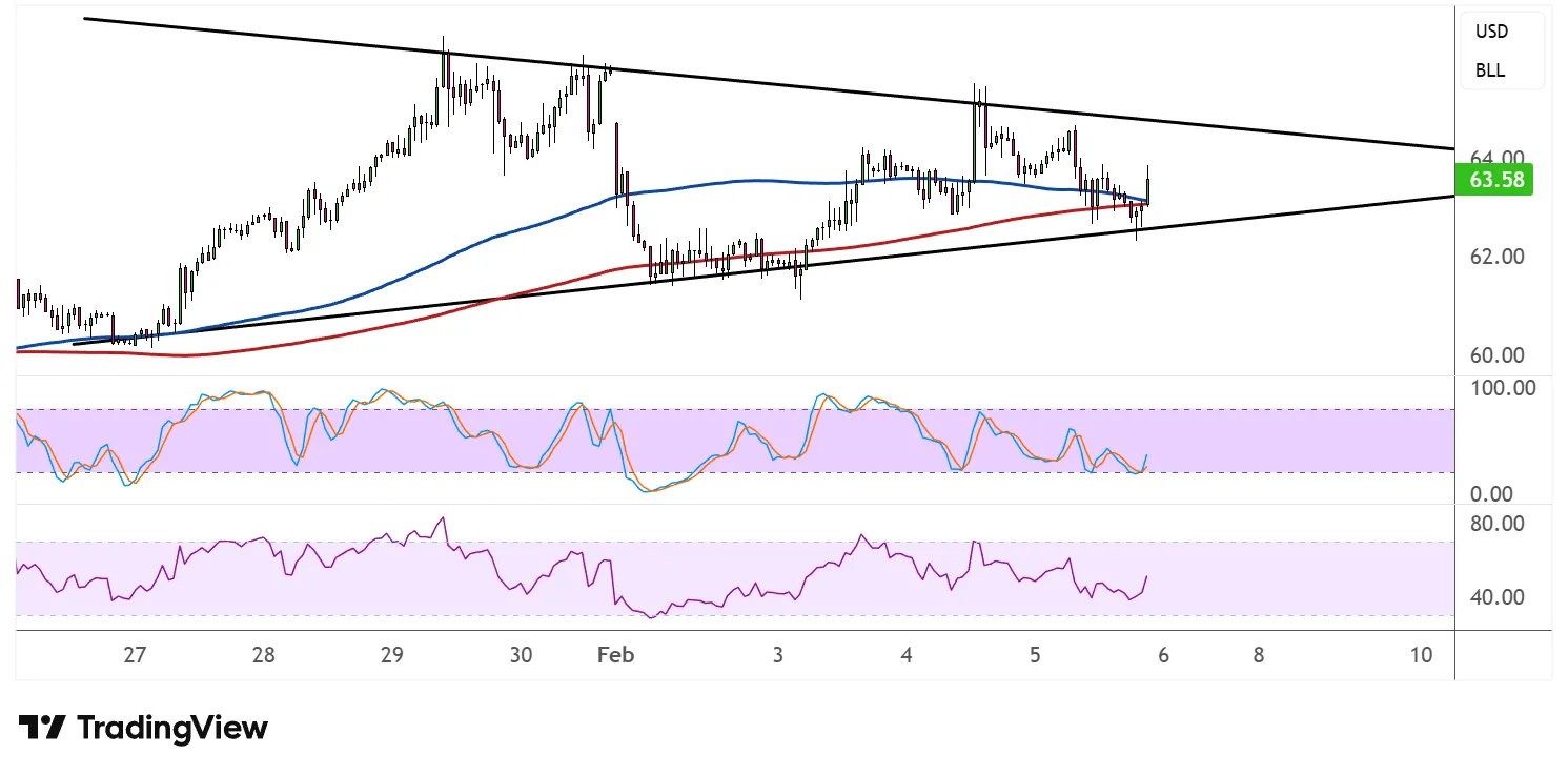 价格目前在三角形底部测试支撑,价格约为每桶63.58美元,该拐点可能决定下一轮走势方向。