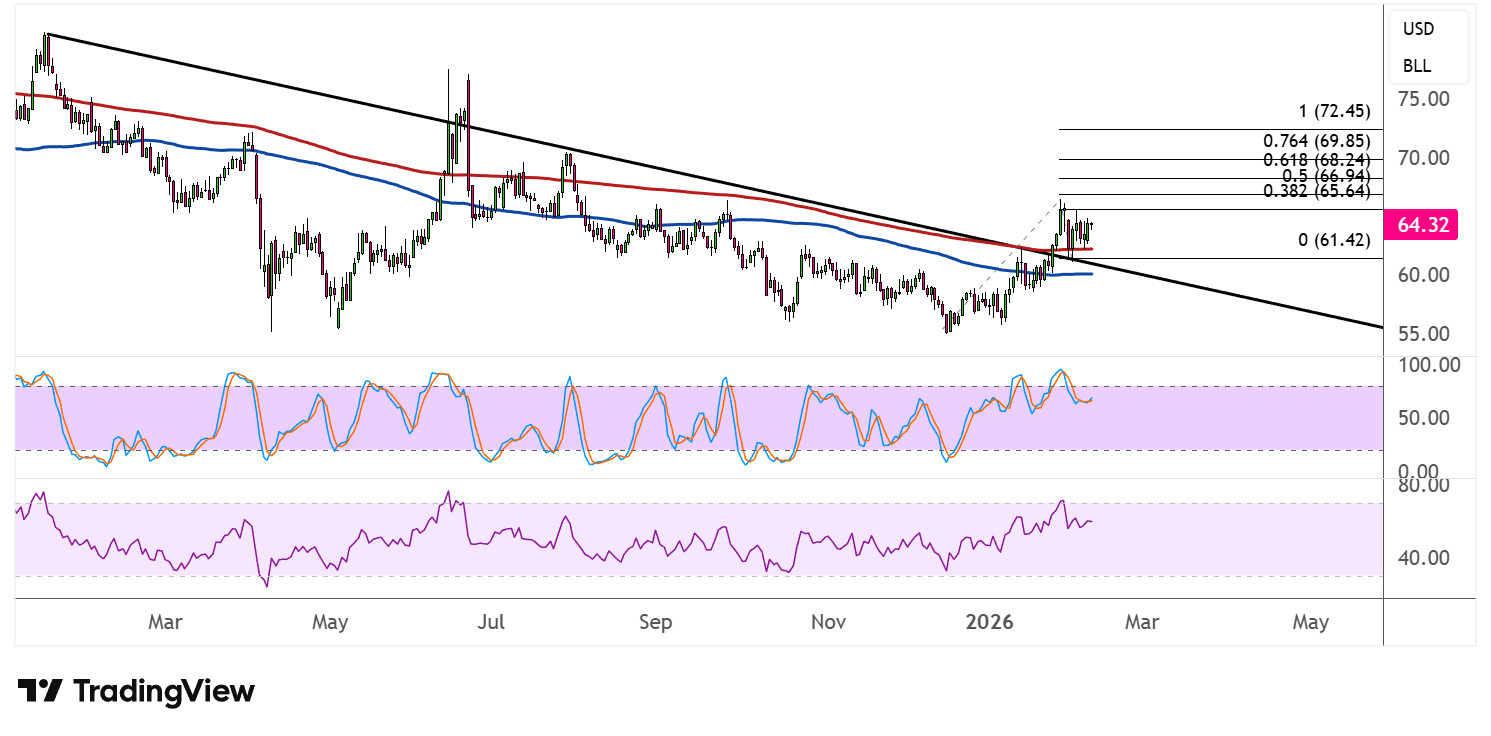 此次突破表明原油可能准备推向斐波那契延伸水平,这一水平源自近期低点至高点的摆动。最近的上行目标约在65.64美元,与0.382Fib延伸线相符。